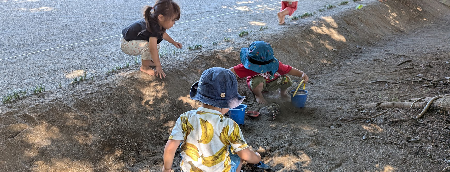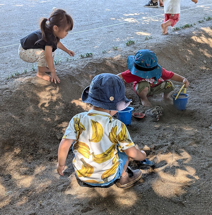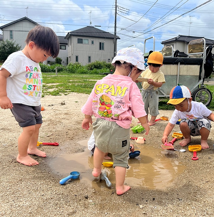 靴下をはかずに裸足で土や芝生、水を感じ心身の発達を促し、水遊びを楽しみます。