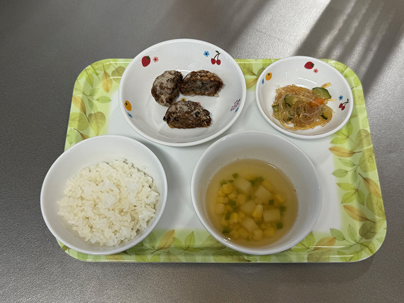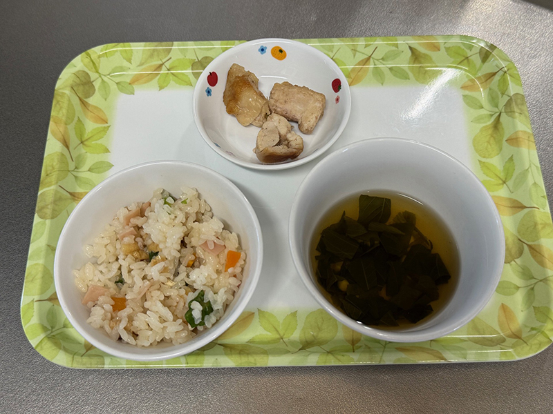 メニューはごはん、しそ香る豚のからあげ、春雨サラダ、わかめスープ