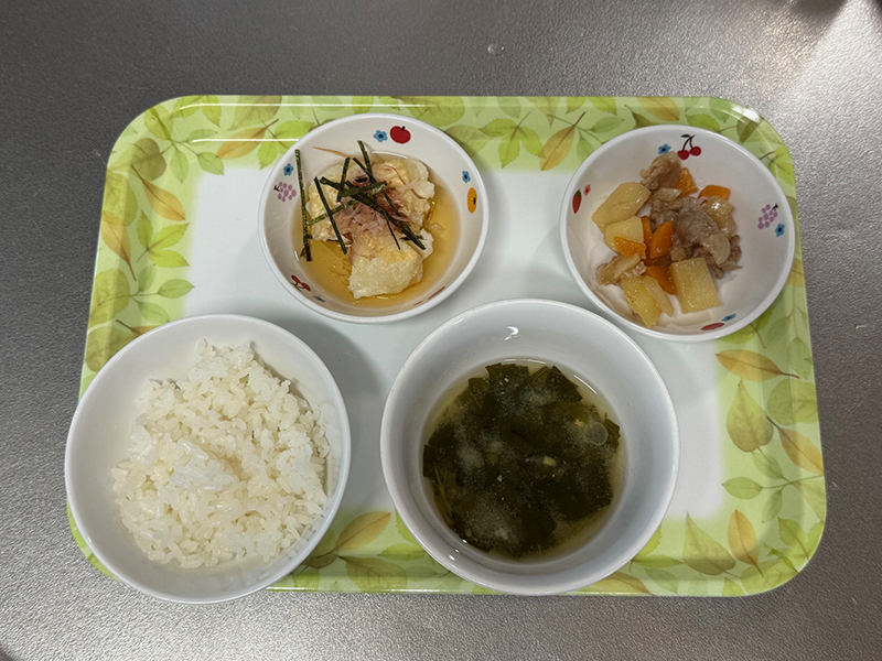 メニューはごはん、揚げだし豆腐、香味ジャーマンポテト、なめことねぎの味噌汁