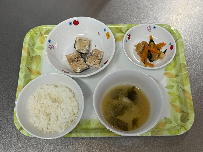 メニューはごはん、サバのトマト煮、切り干し大根のうま煮、味噌汁