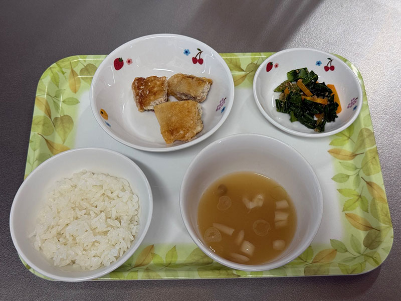 メニューはごはん、さばの竜田揚げ、青菜と切干大根のごま和え、納豆の味噌汁