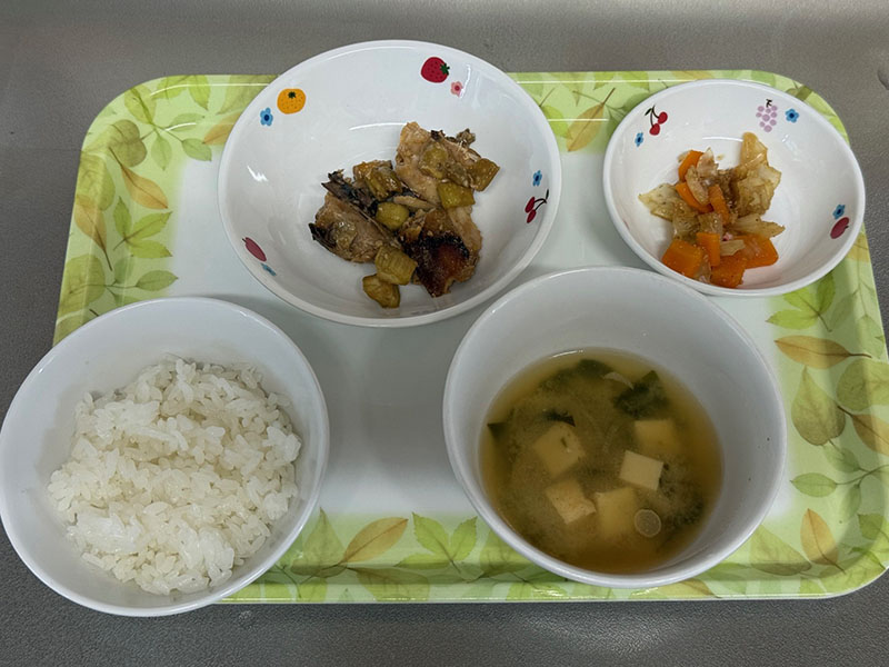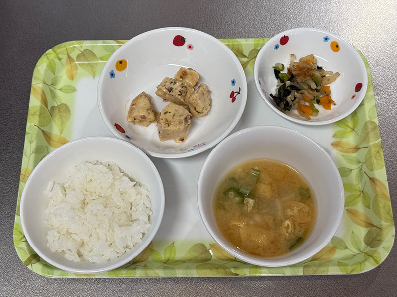 メニューはごはん、ささみの梅しそ焼き、青菜の土佐和え、すまし汁