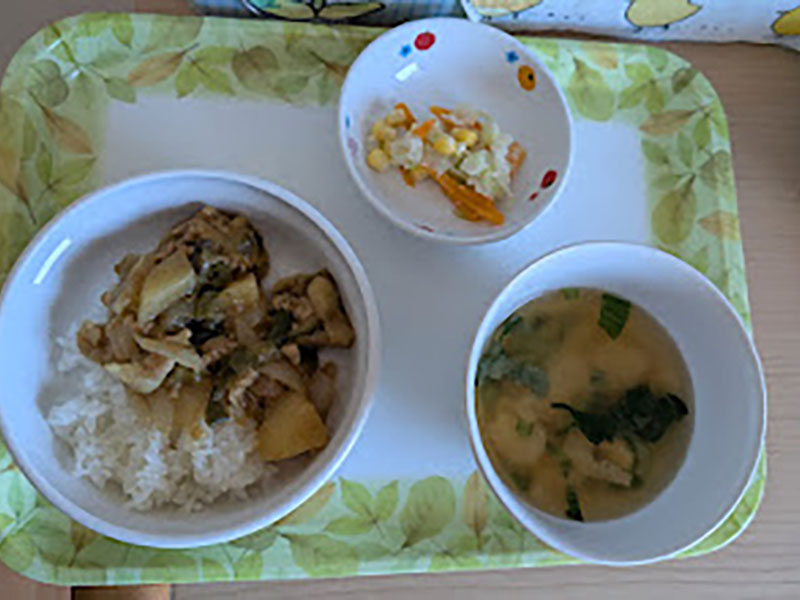 メニューはごはん、鶏肉の味噌漬け焼き、青菜の胡麻和え、赤だし味噌汁