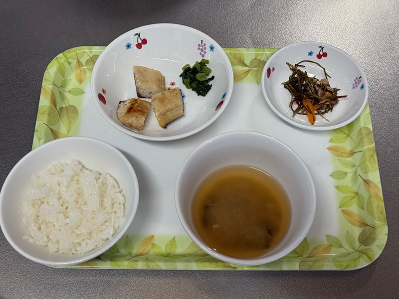 メニューはごはん、さわらの香り焼き、糸昆布の煮物、焼き海苔のすまし汁