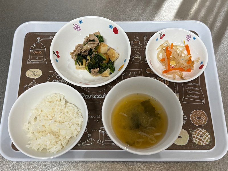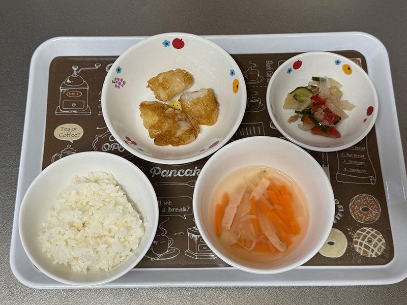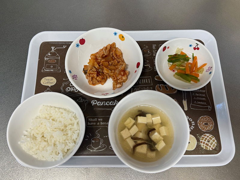 2025/10/27 2025年10月20日(月) メニューはごはん、アジのから揚げ、ツナと切り干し大根の和え物、すまし汁 2025年10月21日(火) メニューはごはん、鶏のから揚げ、青菜のお浸し、新ごぼうの味噌汁 2025年10月22日(水) メニューはごはん、厚揚げと青菜の甘味噌炒め、もやしと人参の和え物、切干大根の赤だし 2025年10月23日(木) メニューはごはん、白身魚の和風ムニエル、トマトのマリネ、スープ 2025年10月24日(金) メニューはごはん、豚肉ときのこのトマト味噌炒め、キャベツのおかか和え、すまし汁