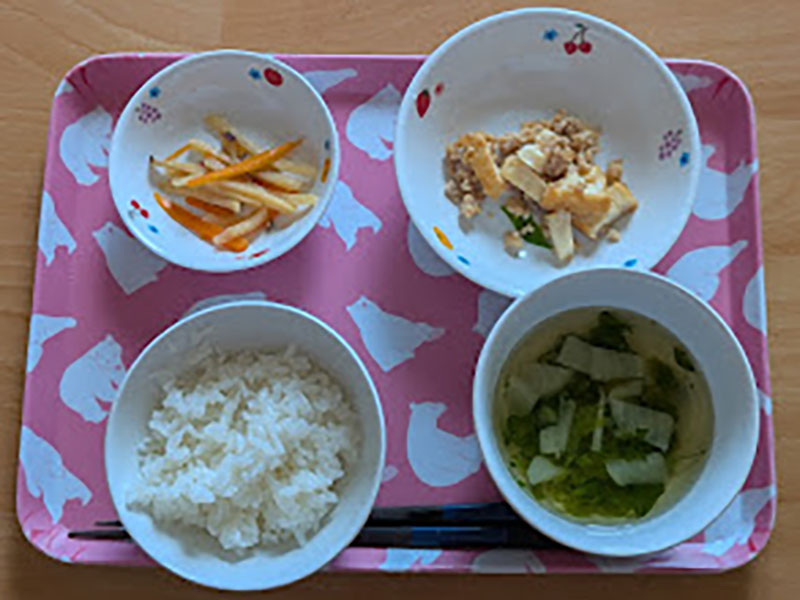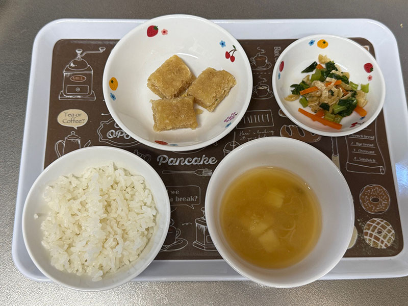 メニューはごはん、すり身のふわふわ焼き、三色煮浸し、じゃがいもの味噌汁