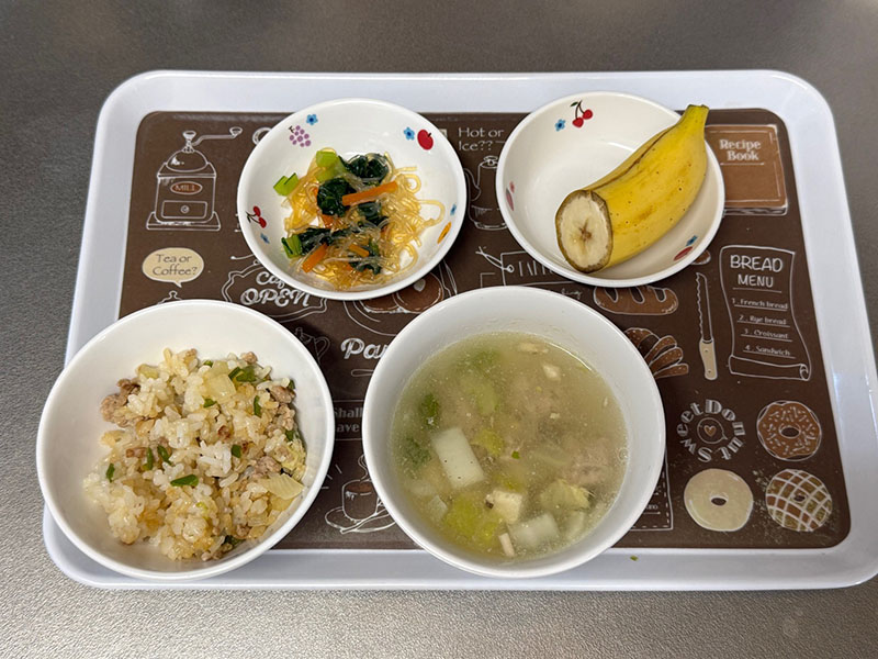 メニューはアスパラガス入りチャーハン、白菜と肉団子のスープ、春雨サラダ、バナナ
