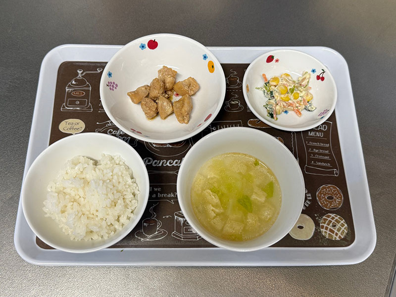 メニューはごはん、甘辛チキン、豆苗とコーンのサラダ、もずくスープ
