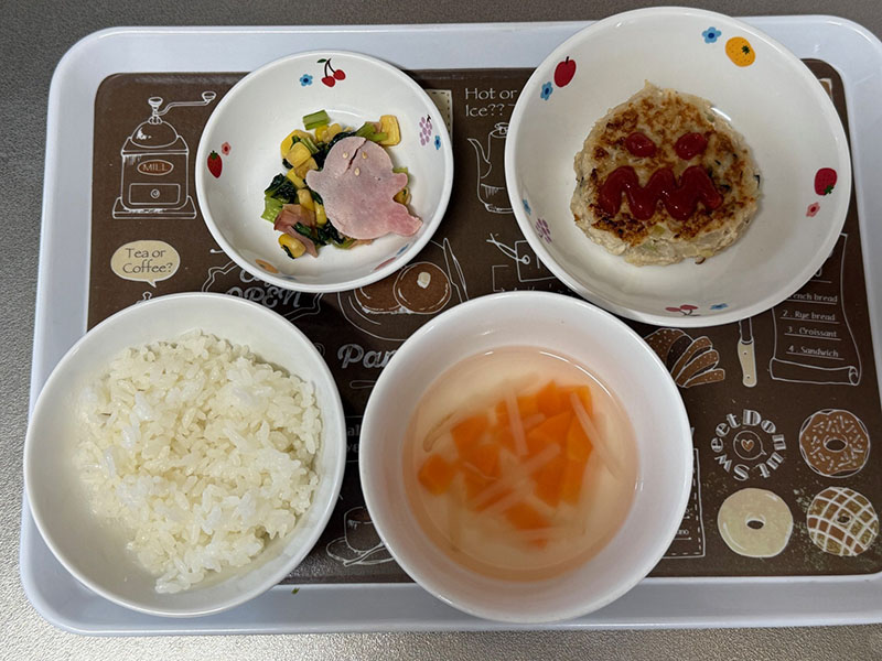 メニューはごはん、和風ハンバーグ、青菜の炒め物、もやしのスープ