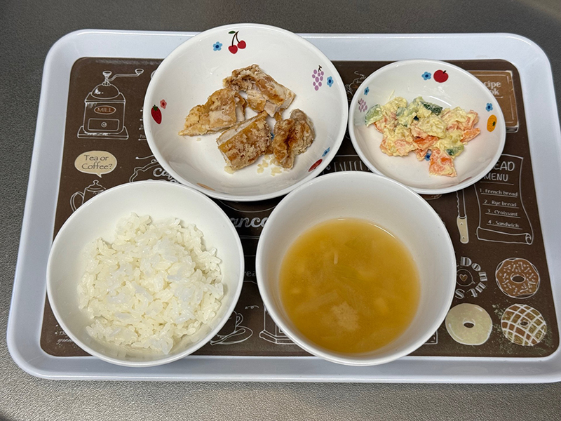 メニューはごはん、鶏のからあげ、ポテトサラダ、玉ねぎの味噌汁