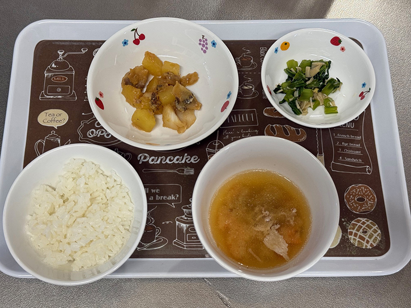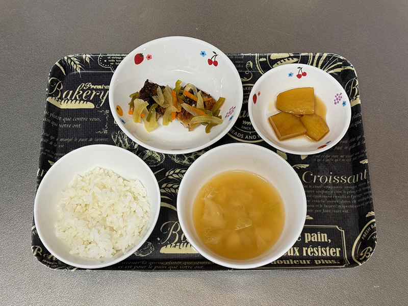 メニューはごはん、アジの南蛮漬け、さつまいもの甘煮、キャベツときのこのすまし汁