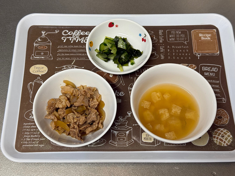 メニューは豚丼、胡瓜とわかめの酢の物、味噌汁