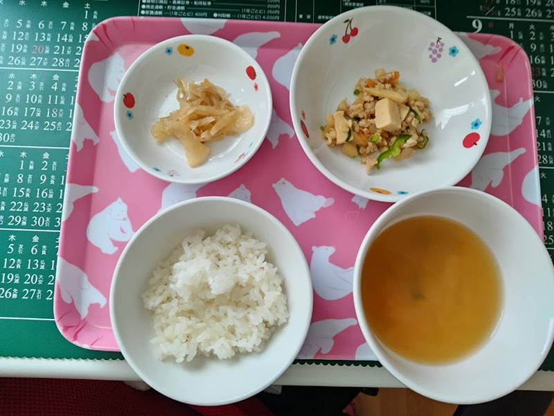 メニューは高野豆腐そぼろごはん、かみかみ切り干し大根のサラダ、玉ねぎの味噌汁