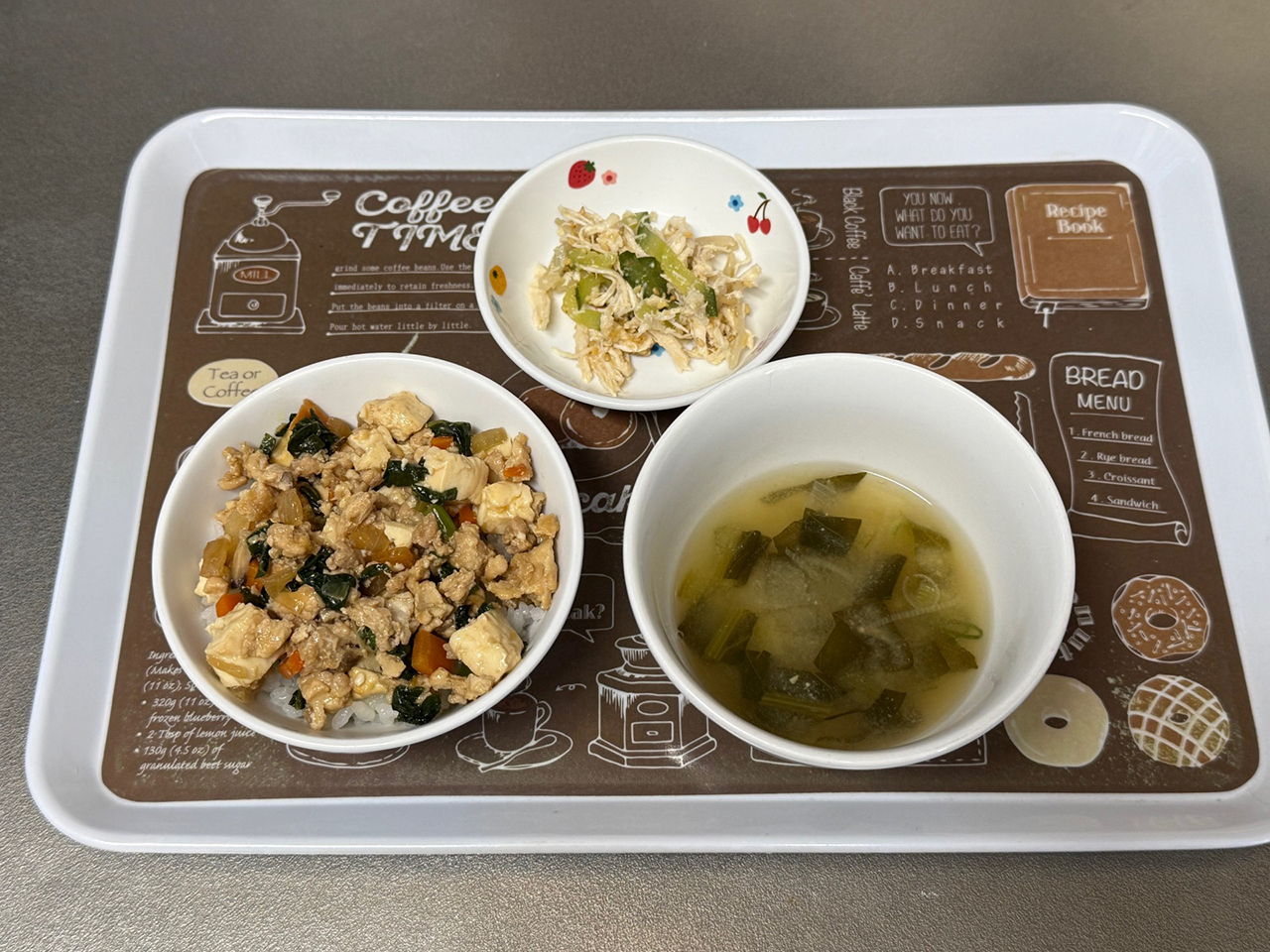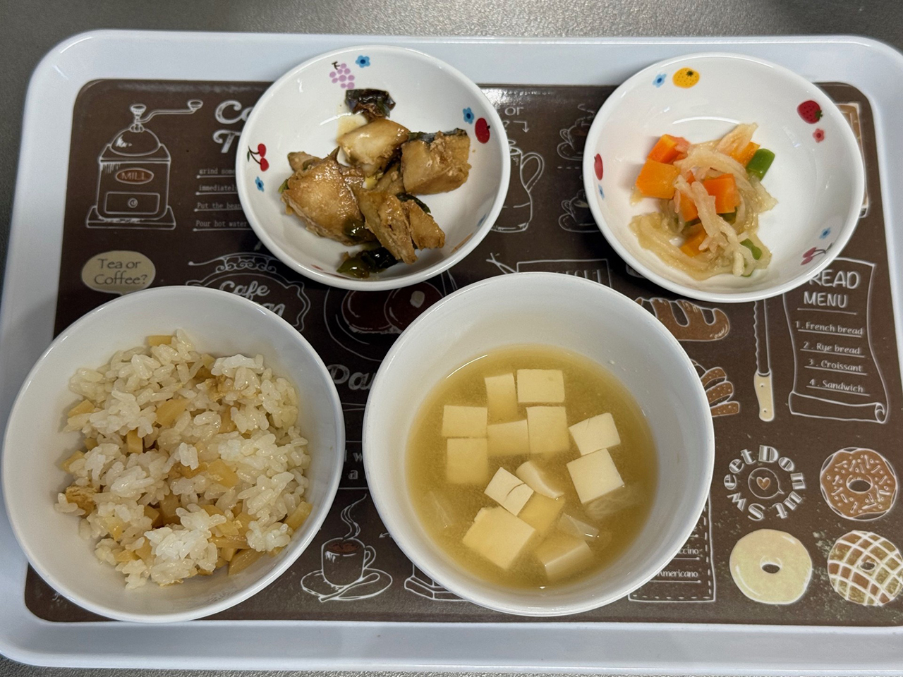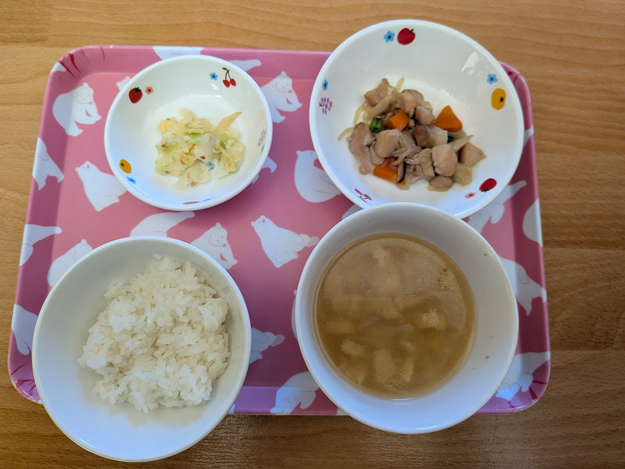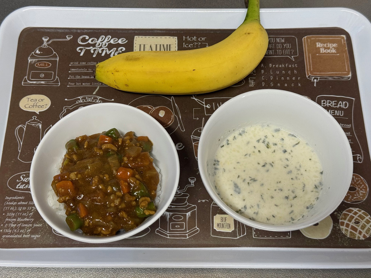 2025/12/19 2025年12月15日(月) メニューはごはん、いんげん入りドライカレー、ジャガイモとコーンのポタージュ、バナナ 2025年12月16日(火) メニューは炒り豆腐丼、バンバンジー、味噌汁 2025年12月17日(水) メニューは筍ごはん、鰆の照り焼き、切干大根の甘酢和え、豆腐の赤だし 2025年12月18日(木) メニューはごはん、筑前煮、胡麻マヨキャベツ、たまねぎの味噌汁 2025年12月19日(金) メニューはビビンバ、春雨サラダ、わかめと椎茸のスープ