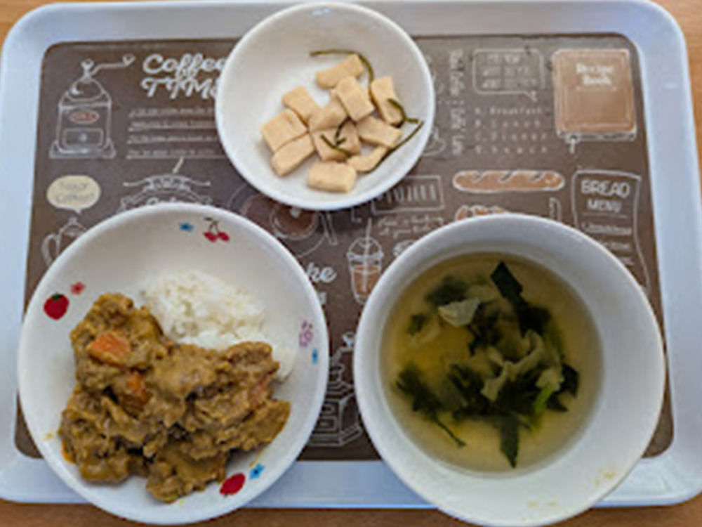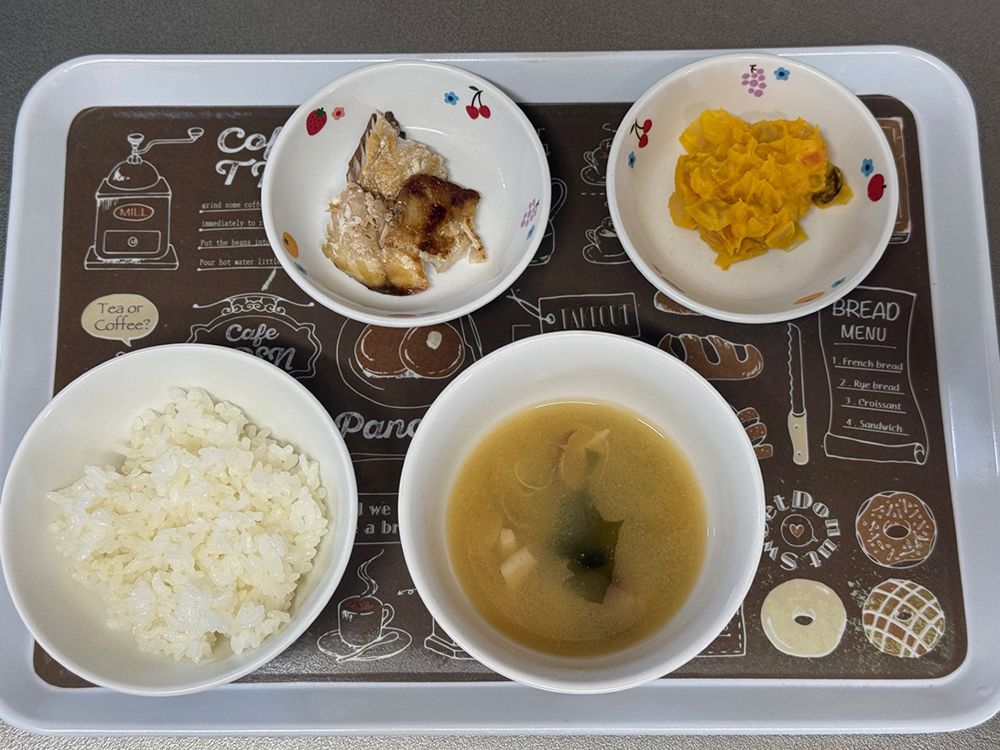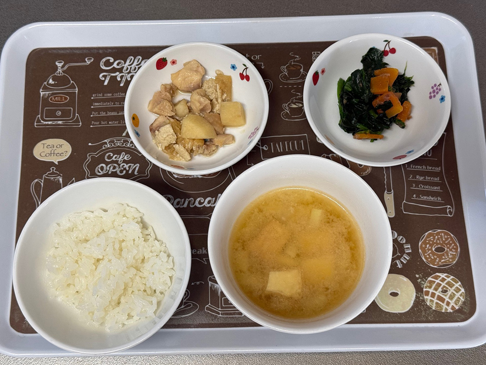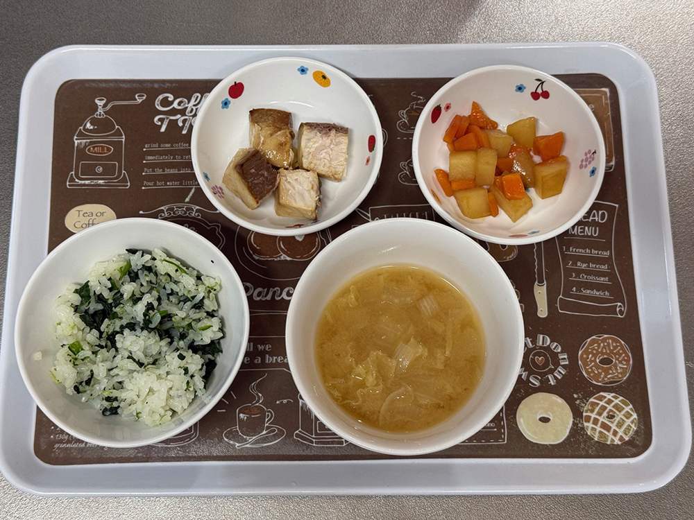 2026/03/13 2026年3月9日(月) メニューはカレーライス、ひじきとキャベツのサラダ、スープ 2026年3月10日(火) メニューは菜飯、魚のステーキ、じゃがいもと人参のきんぴら、キャベツの味噌汁 2026年3月11日(水) メニューはごはん、麻婆なす、もやしときゅうりのナムル、玉ねぎとシイタケのスープ 2026年3月12日(木) メニューはごはん、鶏肉と里芋の煮もの、青菜の梅和え、蓮根と厚揚げの味噌汁 2026年3月13日(金) メニューはごはん、魚の塩焼き、かぼちゃのサラダ、味噌汁