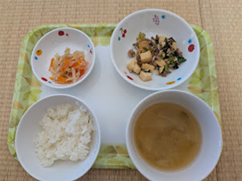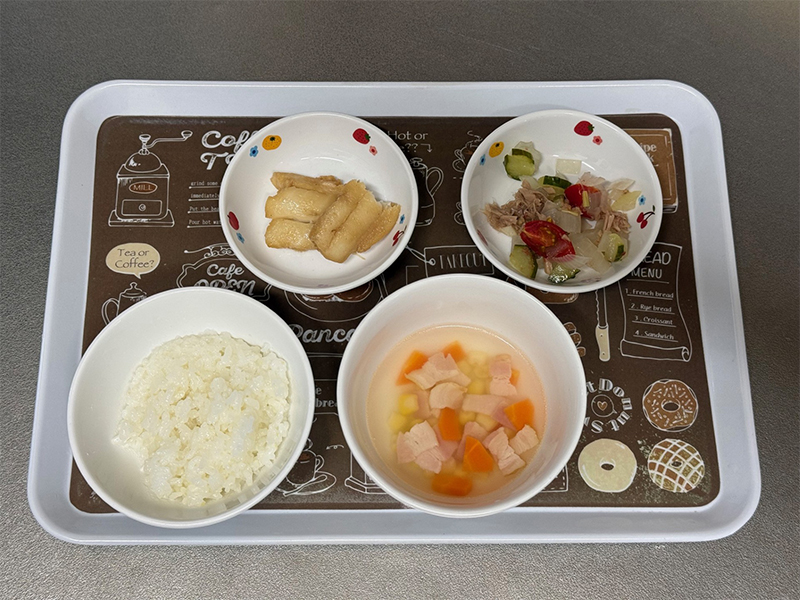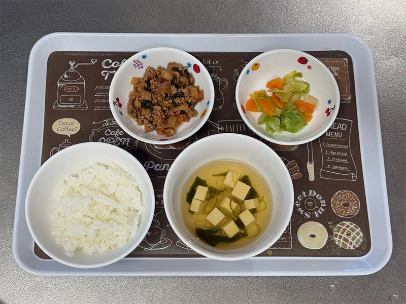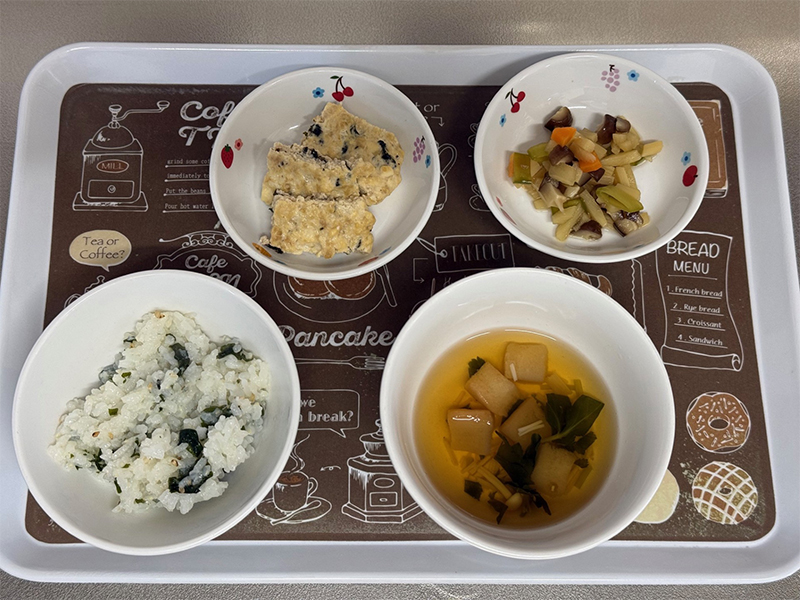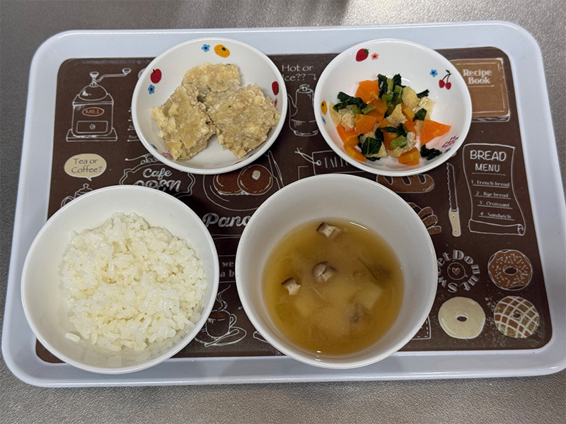 2026/04/14 2026年4月6日(月) メニューはごはん、厚揚げと青菜の甘味噌炒め、もやしと人参の和え物、切干大根のみそ汁 2026年4月7日(火) ごはん、白身魚の和風ムニエル、トマトのマリネ、スープ 2026年4月8日(水) ごはん、豚肉ときのこのトマト味噌炒め、キャベツのおかか和え、みそ汁 2026年4月9日(木) わかめごはん、豆腐のお焼き、春の煮物、三つ葉のすまし汁 2026年4月10日(金) ごはん、すり身のふわふわ焼き、三色煮浸し、じゃがいもの味噌汁