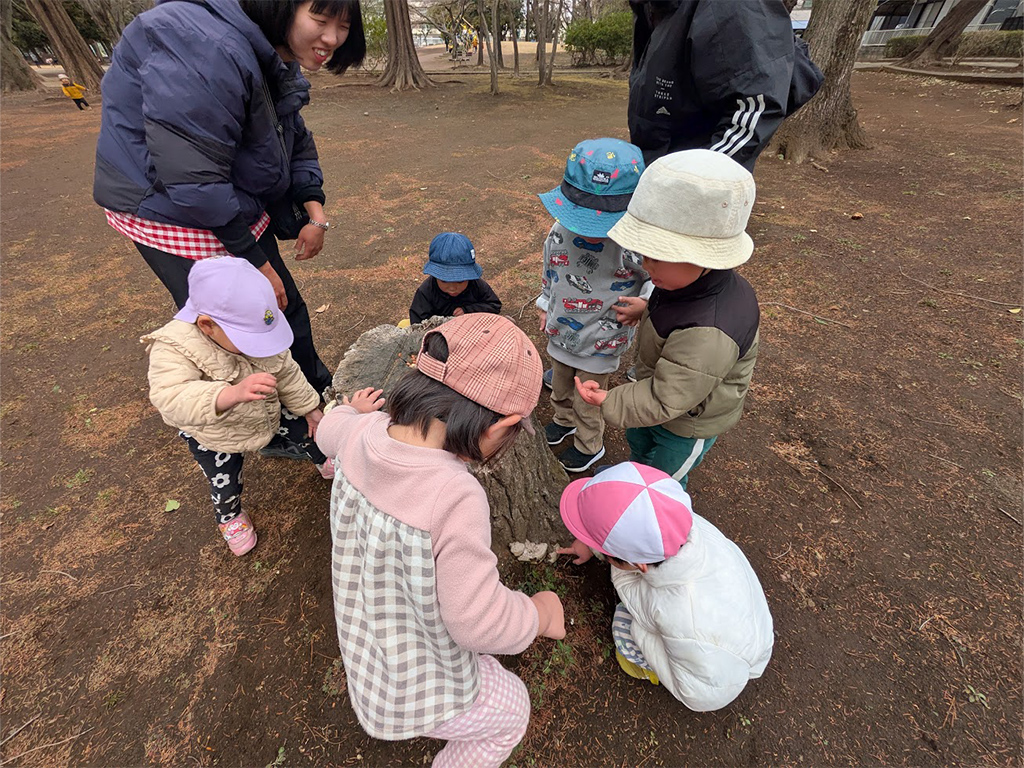 切り株にあるキノコを珍しそうに眺めるこどもたち。